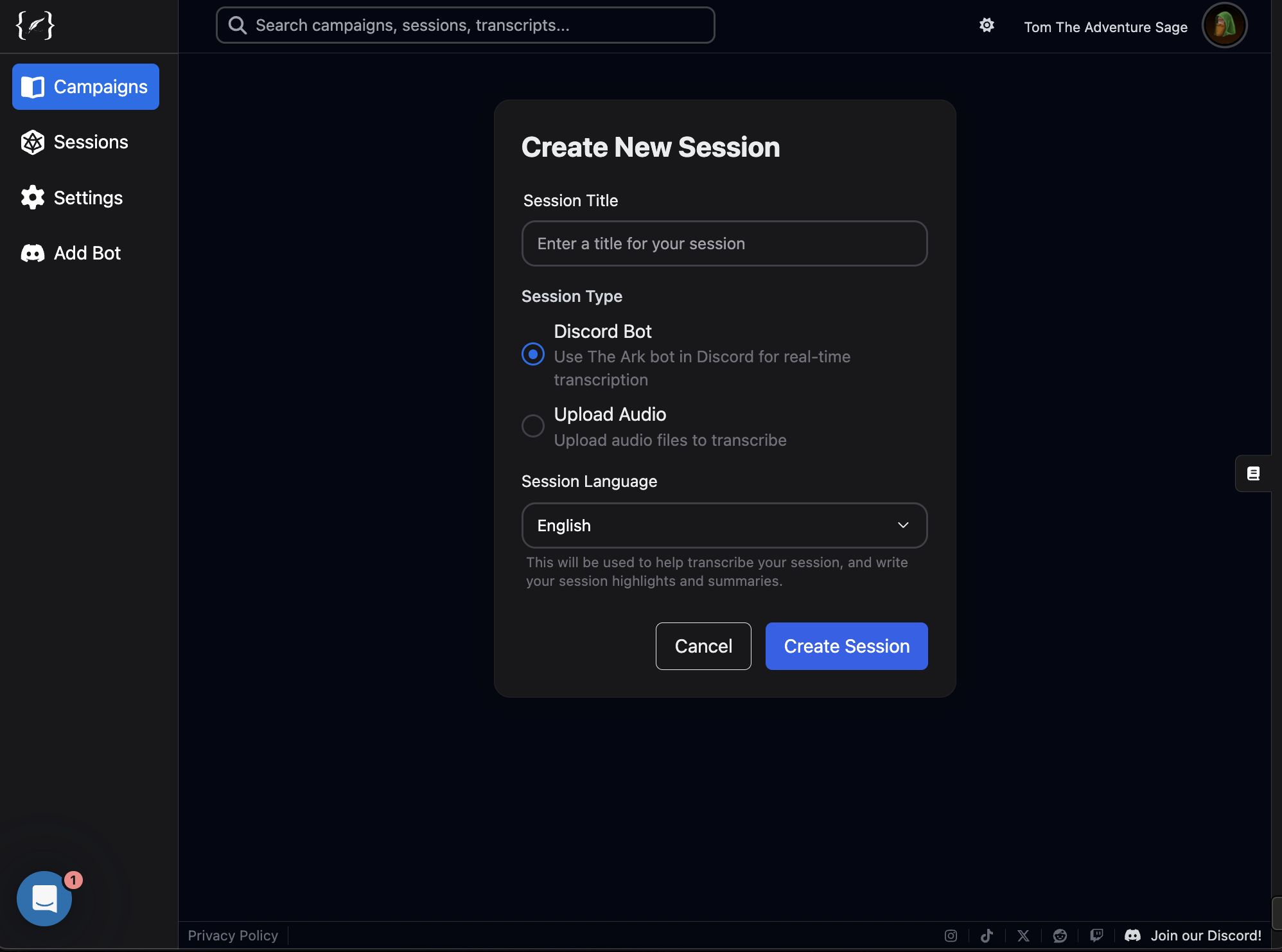 Transcribe your Dungeons and Dragons sessions in Discord or via audio upload, and get automatic post-session notes and summaries. Let The DM’s ARK do the remembering, you focus on the adventure.