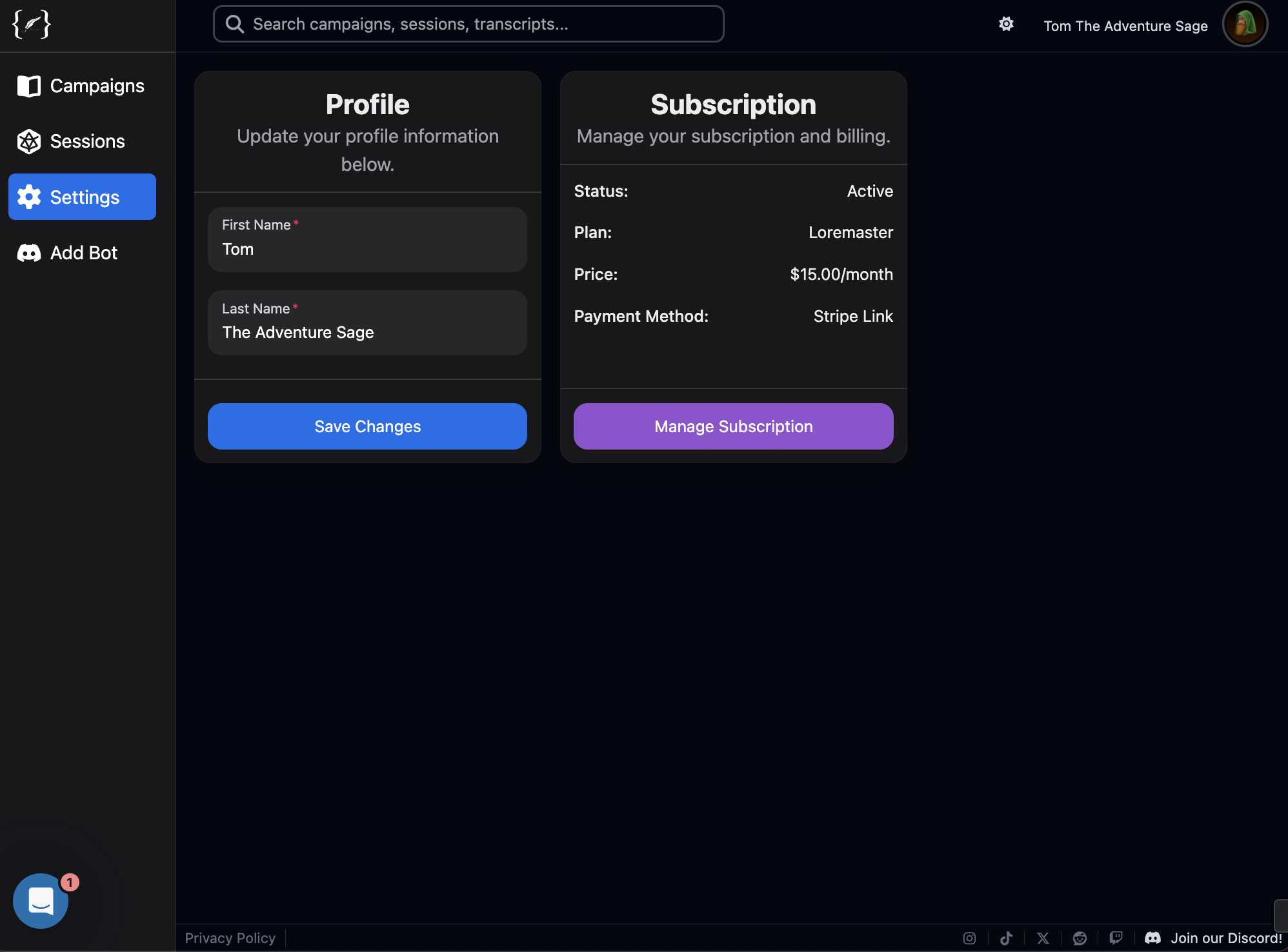 Real-time transcription, storage, and retrieval tools aren’t free to run. Our tier system starts at $6/month and is designed to keep The ARK affordable while covering the basic costs of servers and APIs. During this beta period, The ARK is entirely free to use. All we ask in return is your honest feedback so we can build the best possible tool for DMs together.